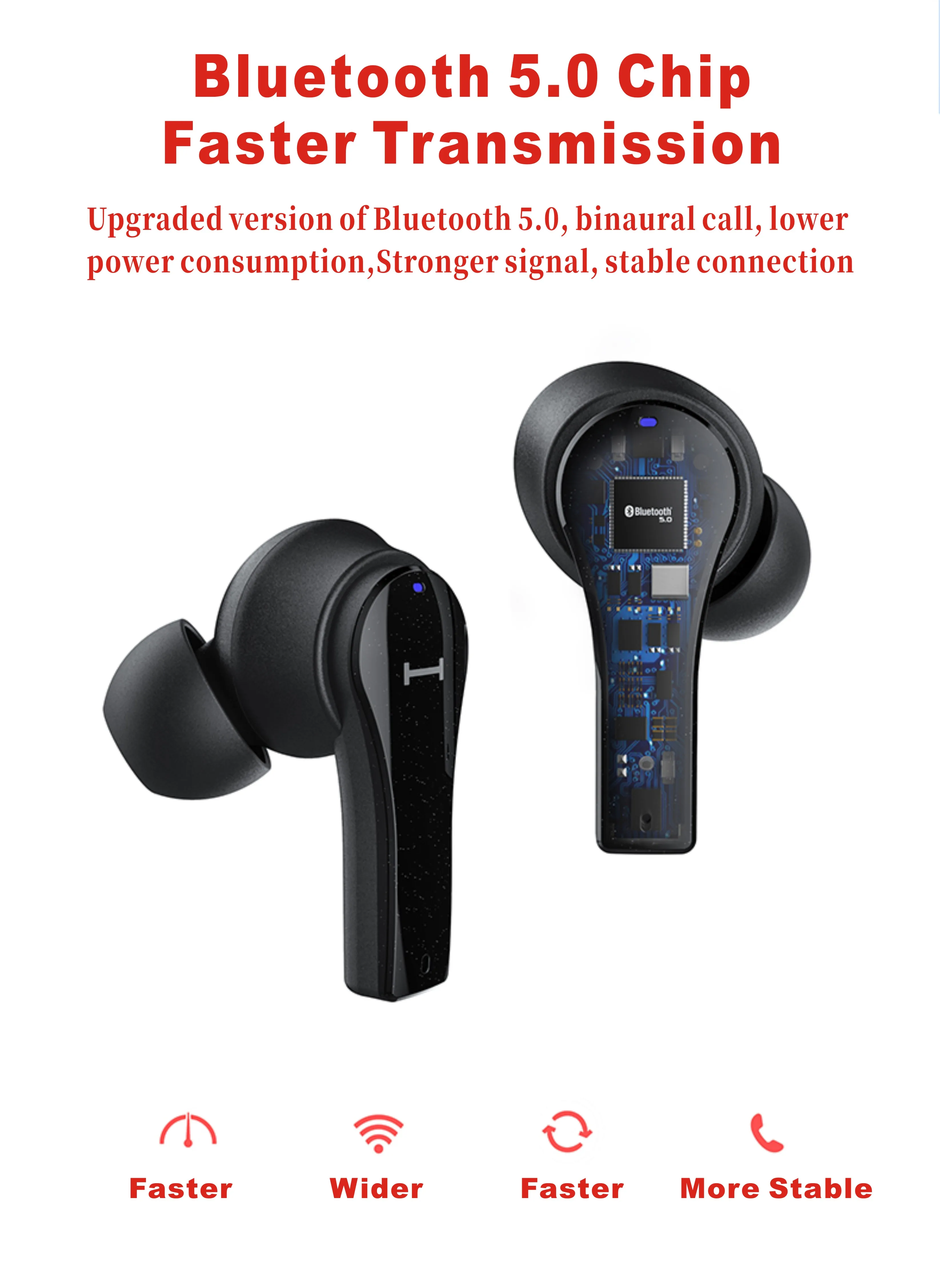 La technologie BT 5.0 assure une vitesse de transfert de données plus élevée, une connexion plus stable et plus rapide et une consommation d’énergie plus faible. Véritable conception à double oreille sans fil, les canaux gauche et droit des écouteurs sont séparés. Il peut être utilisé seul ou par paires. Conception de contrôle tactile, plus de pression sur vos oreilles. Facile à contrôler la musique et les appels, et activer l’assistant vocal. Le micro intégré sur les deux écouteurs avec réduction intelligente du bruit offre un son parlant plus clair en mode stéréo. Un étui de charge de 400mAh peut charger et stocker les écouteurs. La batterie de 40mAh dans chaque écouteur offre 6-8 heures de musique. 4.1g léger et taille mini s’adapte bien à votre conduit auditif, offrant un confort et une stabilité à long terme.